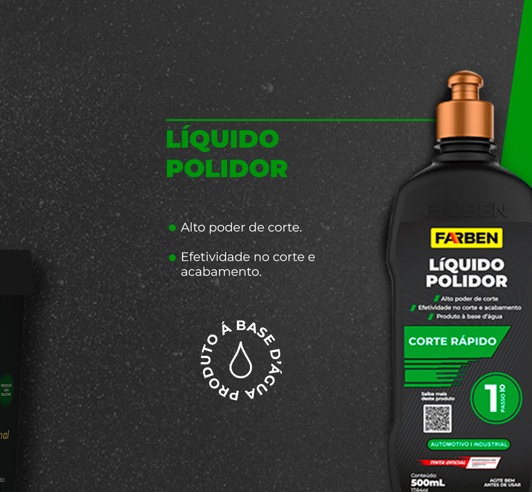 Líquido polidor corte rápido é um polidor primário a base d’água de alta tecnologia, de alto rendimento e com alto poder de corte. Destinado a todo tipo de pintura. Este produto foi desenvolvido para uma remoção rápida das marcas de lixamento do grão P1200 ou mais fino. Sua composição microabrasiva promove a eliminação de imperfeições da pintura de forma rápida e efetiva, assim efetuando um acabamento de alto brilho.