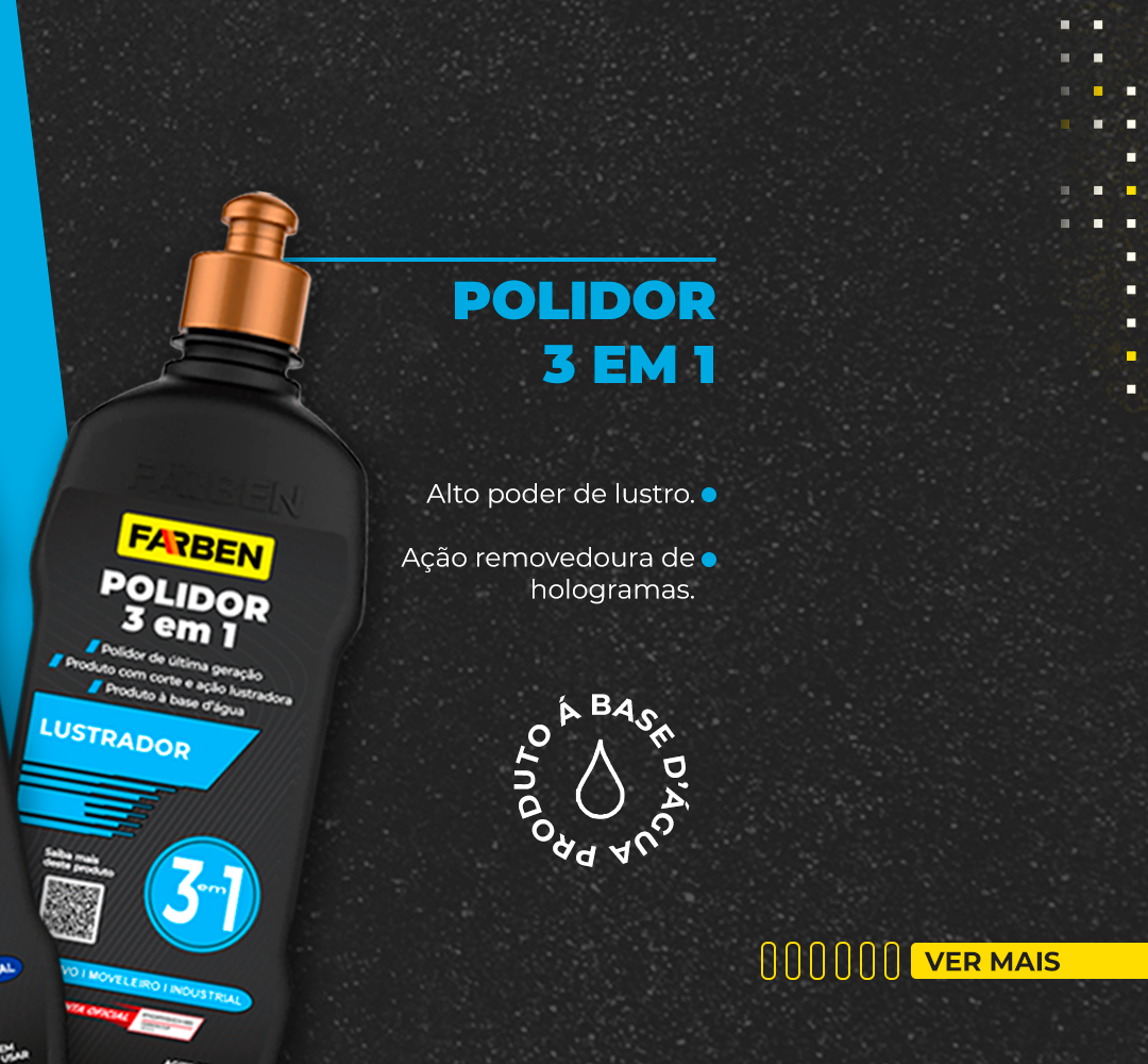 Polidor 3 em 1 é um polidor inovador base d’água de alta tecnologia, com ação 3 em 1, sendo corte, refino e lustro. Este polidor pode ser utilizado tanto como polidor de corte, polidor médio quanto polidor de lustro final. Sua versatilidade em opções de aplicação faz dele um polidor completo no quesito polimento e espelhamento. Sua combinação com as diferentes boinas de espuma Farben proporciona diferentes níveis de polimento.